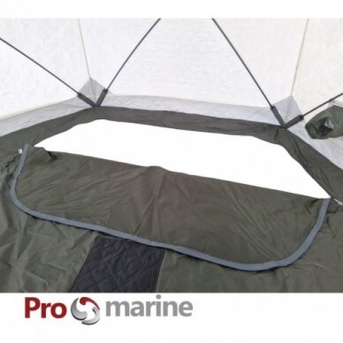 Soojustatud Pop-Up telk PROMARINE pakub jääpüügil maksimaalset mugavust. Kolmekordne seinte ja lae materjal koos termokihiga hoiab talvisel kalapüügil veelgi rohkem soojust isegi kõige karmimates tingimustes. Telgi saab püsti panna või pakkida vähem kui mõne minutiga. Ilma selle telgita on öine kalapüük keeruline. Usaldusväärne tuulevari, kaitse lume, külma, jäitevihma jms eest. Päeval laseb telgi seinte hele värv läbi piisaval hulgal valgust ja täiendavaid valgusallikaid pole vaja. Tumedam katus kogub nappi päikesesoojust. Kolmekihilised aknad (tume kardin, läbipaistev PVC või võrk) võimaldavad telki vastavalt oludele ja vajadustele kohandada. Uus: pliidi või Webasto küttekeha ühendamiseks pole vaja seintesse ega lakke auke lõigata. See on juba tehtud. Küljel on kaks auku, mille külge saab hõlpsalt Webasto küttekeha ühendada. Lisaks on telgil põhi, millel on kalapüügiks mõeldud lukuga ava. Telgi muud omadused ja tehnilised omadused: Telgi tüüp: kiirkokkupanekuga Pop-Up telk Soojustatud, talvine Materjal: kahekihiline 300D Oxford (veekindel) ja keskmine kiht termomaterjalist Suurus 2 erinevat mõõtu: põrand 2x2 m, kõrgus 1,9 m (kõrgeimast kohast) hind 315 EUR, Põrand 2,6x2,25 m, kõrgus 1,9 m (kõrgeimast kohast) hind 395 EUR, Põrand, kus on kalastusauk, on lukuga suletav. Ventilatsiooniavad laes Korstna ühendusava laes Webasto ühendusaugud seinas Seintel olevad hoiutaskud – 2 tk. Värv: seinad – helehall, katus, liistud – must Raam: klaaskiud (11 mm) Ukse tõmblukk: kahepoolne Kolmekihilised aknad: tume kardin, läbipaistev PVC või võrk – 2 tk. Kandekott – 1 tk. Vaiade/köie kott – 1 tk.